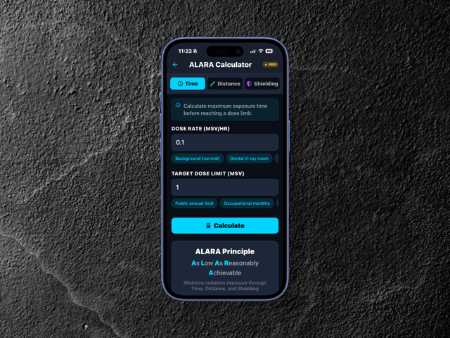 Built in ALARA (As Low As Reasonably Achievable) calculator to help measure safe distances away from potential radiation threats.